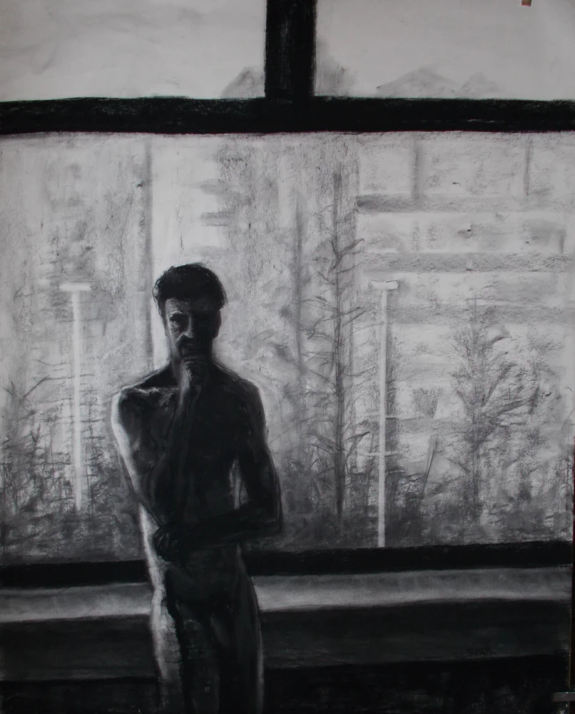 Male model Martin standing in front of the window of the class room, dreaming about...